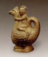 說 明: 胎白質細,釉白泛灰,釉厚處發(fā)黃綠,底有流釉現(xiàn)象。此壺型陶塑十分奇特,構思巧妙。