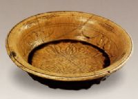 說(shuō) 明: 盆內(nèi)施黃釉劃荷蓮、水波紋,盆外施黑釉,口沿一周無(wú)釉。