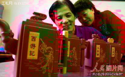 2008年6月26日,江蘇宜興陶藝家羅澤南展示制作的“四大名著”紫砂壺。當(dāng)日,一套將古典文藝與民間紫砂藝術(shù)相融合的“四大名著”紫砂壺在陶藝之鄉(xiāng)宜興市丁蜀鎮(zhèn)亮相。這套融“西游記”、“三國(guó)演義”、“水滸傳”、“紅樓夢(mèng)”四大名著集一身的紫砂壺外形似書(shū)簡(jiǎn),每件作品上都陶刻了該名著的代表人物,形象生動(dòng)。