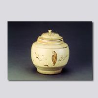 首都博物館藏。直口,短頸,豐肩,直壁,平底。鈸式蓋,蓋上以黑彩繪簡單的草葉紋。腹部畫曠野中前后有兩個老者駐足而立,老者衣服用赭彩繪畫,用黑彩勾邊。紋飾筆觸極其簡練,生動流暢,表現(xiàn)了磁州窯濃郁的民間生活氣息。