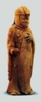 用陶俑陪葬在秦至唐代貴族墓葬中較流行,主要根據(jù)各時期官吏的形象雕塑而成,以顯示死者生前顯赫的地位。此俑出土于墓中,該墓共出土了近四十件陶塑,為研究隋代的墓葬習俗和陶塑藝術(shù)提供了寶貴的實物資料。在出土的陶俑中.只有兩件為守門武士俑,他們一手按盾,一手執(zhí)兵器(所執(zhí)兵器已脫落)。一為張口鼓目,面帶笑容,一為豎眉鼓眼,臉為怒容。