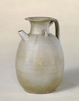 壺撇口,束頸,溜肩,長圓腹,圈足。通體呈四瓣瓜棱形,肩部一側置短流,另一側置曲柄,與流、柄成十字形的頸、肩之間置雙系。通體內外及圈足內均施青釉。此壺造型圓潤飽滿,釉質潤澤,為晚唐越窯的代表作品。