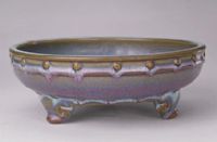 鼓釘洗是鈞窯瓷器中常見的造型品種,這種富于裝飾性的器物配以如意頭形足活潑輕巧,匠心獨(dú)具。此為宋代宮廷陳設(shè)用瓷。