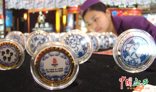景德鎮(zhèn)市周六福鉆石珠寶店的工作人員在觀看“奧運(yùn)青花瓷金銀紀(jì)念章”。