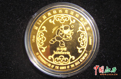 在景德鎮(zhèn)市周六福鉆石珠寶店拍攝到的“奧運(yùn)青花瓷紀(jì)念金章”正面“吉祥物”。