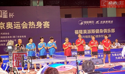 7月12日,正在廈門進行封閉訓(xùn)練的國家乒乓球男隊在廈門湖里區(qū)中國乒乓球訓(xùn)練基地舉行“福隆杯”中國乒乓球隊北京奧運會熱身賽。國家男乒即將參加奧運會的主力隊員王皓、王勵勤和馬琳(2008奧運隊),替補隊員陳玘、馬龍和張超(2012奧運隊)等優(yōu)秀選手登場亮相。