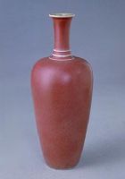 豇豆紅釉器外壁的銅紅釉是分幾次吹釉然后高溫?zé)傻。由于釉中含有微量銅的成份,在燒成過(guò)程中會(huì)造成氧化而產(chǎn)生綠色的斑點(diǎn),俗稱苔點(diǎn),摻雜在紅釉色中相映成趣?滴醭瘎(chuàng)新的萊菔瓶中以豇豆紅釉為最佳,此瓶釉色勻凈典雅,只在口部呈現(xiàn)綠斑點(diǎn)點(diǎn),惹人喜愛(ài)。