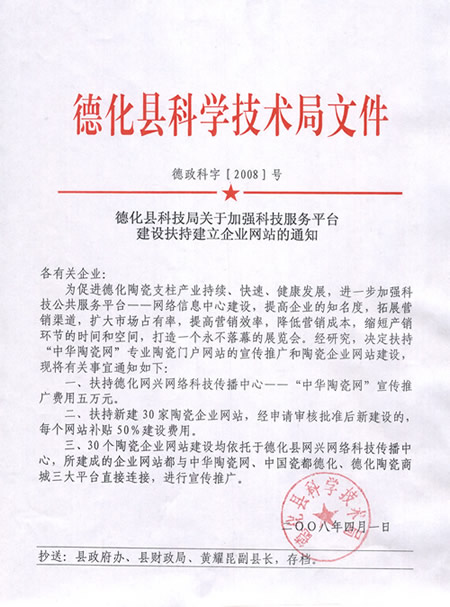 2008-4-2近日,德化縣科技局決定,將通過“德化網(wǎng)興網(wǎng)絡(luò)科技傳播中心”扶持建立30家德化陶瓷企業(yè)網(wǎng)站,德化科技局將補(bǔ)貼50%的網(wǎng)站建設(shè)費(fèi)用,企業(yè)自費(fèi)50%,以帶動(dòng)企業(yè)上網(wǎng),建立新的營銷渠道,擴(kuò)大市場占有率。