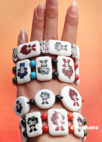 在江西省景德鎮(zhèn)營(yíng)業(yè)員展示奧運(yùn)福娃瓷手鏈。