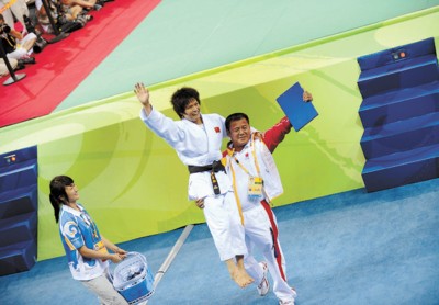 當計時的秒表指向“零”時,在場下緊張觀戰(zhàn)的冼東妹教練興奮地揮舞著雙拳大聲叫喊,而當冼東妹走下場時,教練高興地將她扛起走了幾步。剛剛放下,教練發(fā)現不少攝影記者都在為這位冠軍拍照時,又再度將弟子扛起,而“媽媽冠軍”則在教練寬厚的臂膀上輕輕向眾人揮手致意,臉上露出幸福的微笑。