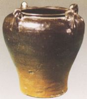 斂口,雙肩,肩以下漸收,平底。肩部堆貼四耳。外施黑釉,胎質(zhì)磚紅色,為北方窰場的製品。黑釉瓷器是隨著青瓷的出現(xiàn)而相繼產(chǎn)鏖生的,最早在南方浙江上虞,東漢時已燒造。