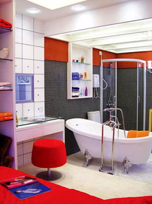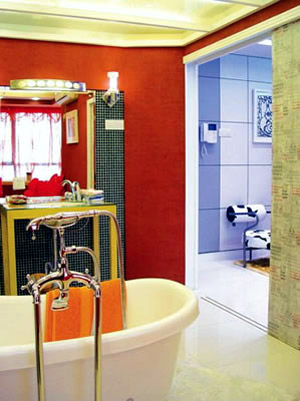 潔白的浴缸比對(duì)相望的嬌艷臥室區(qū),色彩的對(duì)比和相容在一個(gè)共通的空間里,沒有互搶風(fēng)頭,反倒是相互映襯。