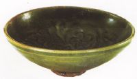 敞口微斂,弧壁,圈足。內(nèi)刻嬰戲蓮紋。通體施青釉,釉色泛黃。胎壁較厚,胎質(zhì)細(xì)膩。此器釉質(zhì)光亮熒潤·所刻嬰戲紋是耀州窯裝飾的典型紋樣、刻花犀利,線條流暢,頑童生動(dòng)可愛,反應(yīng)出耀州窰刻畫技術(shù)之高超