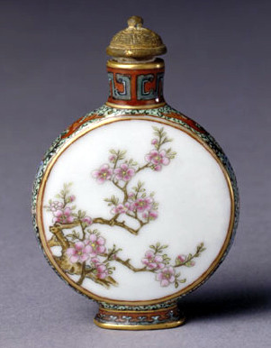 粉彩梅花圖瓷鼻煙壺,清乾隆,通高5.8cm,腹徑4cm。清宮舊藏。