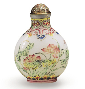 2005年,紐約佳士得舉辦專場(chǎng)拍賣會(huì)拍出一件清乾隆御制琺瑯彩西洋人物圖鼻煙壺,成交價(jià)為550萬(wàn)元人民幣,成為迄今鼻煙壺拍賣的最高價(jià)。而當(dāng)年紐約蘇富比拍賣行以近393萬(wàn)元的價(jià)格,拍出北京造辦處的乾隆粉彩銅胎鼻煙壺,成為鼻煙壺成交價(jià)的亞軍。