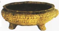 侈口,束頸,淺腹,園底底置三短寶足。腹內(nèi)有輪裂的螺旋紋,腹外部有扉棱三個,飾三組棘刺紋,內(nèi)外滿釉,釉色青花。此器顯示出獨(dú)特的區(qū)域的區(qū)域色彩。