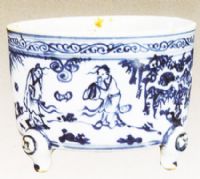 直壁、筒形、三蹄足繪錢帶紋。器身繪賢仕圖,筆法嫻熟、流暢,無(wú)分水現(xiàn)象,青花呈色純藍(lán)不艶,造型端正,胎質(zhì)潔白。此爐為供器。