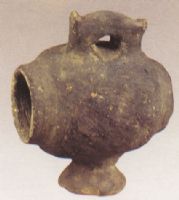 泥質(zhì)灰陶,胎質(zhì)堅(jiān)硬。鼓腹中空,兩端開(kāi)口可以蒙皮。鼓上設(shè)一提梁,腹下置喇叭狀圈足。通體光素?zé)o紋。