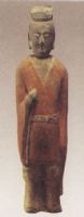 泥質(zhì)灰陶,外敷白色陶衣。俑採立姿。頭戴小冠,臉龐長圓,高鼻大耳,目視前方,雙唇緊閉,表情嚴肅。上身穿交領左衽廣袖衫,腰繫帶,下著縛褲,足尖微露。右手置於胸前,作執(zhí)物狀,拳心有一圓孔,原應有插物,現(xiàn)已失。左臂微曲下垂。上衣齊膝施虹彩。身軀高大魁梧,表情肅穆威嚴,雙腿并攏,作立正狀。