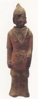 泥質(zhì)灰陶。此俑束髪,於腦後挽一高髻,額繫護(hù)甲,似頭盔,中間起棱,於眉心上部向外捲,甲後部用帶繫於腦後。鼻梁挺直,目視前方。身穿圓領(lǐng)窄袖衫,外罩紅色翻領(lǐng)短褐,腰繫革帶,下著縛褲,繫紅色縛帶。右臂自然下垂,腕部微抬,作握拳狀。左臂向上彎。