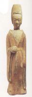泥質(zhì)灰陶。俑採立姿。頭戴黑色籠冠,面龐圓潤豐滿,長眉細(xì)目,鼻梁高挺。身穿交領(lǐng)右衽廣袖衫,下著長裙,腰繫帶。右臂彎曲置於腰部,手作持物狀;左手籠於袖中,自然下垂。