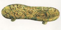 盤呈長條形,中間束腰,兩端為圓弧形。盤口微斂,淺腹,平底,下設(shè)四個馬蹄足。盤身以淺黃色釉為地,上以綠、赭兩色繪同心圓狀花紋