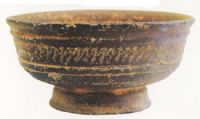 侈口,深腹,高圈足外撇。腹部兩組雙線凹弦紋,其間飾一組水波紋。表面刷黑色陶衣。