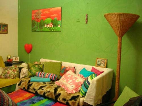 客廳大面積的綠色是一大特點(diǎn),另外,加了紅色等對比強(qiáng)烈的顏色。