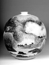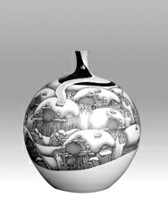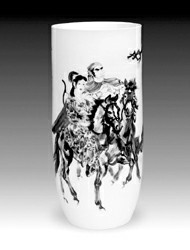 這些陶瓷名家精品,從三個(gè)層面詮釋了“當(dāng)代陶瓷從傳承走向創(chuàng)新”的主題:其一,民間老藝人傳承官窯制瓷技法,創(chuàng)造了當(dāng)代官窯的神話。老藝人鄒寶林年近八旬,歷時(shí)整整三年,創(chuàng)作了《紅樓十二金釵》瓷瓶。此外,吳元清、葉冬青、雷火蓮、祝九根、楊家鑫等民間陶藝家也展示了他們的重工粉彩瓷瓶,給人以極大的審美享受。其二,中國(guó)工藝美術(shù)大師引領(lǐng)當(dāng)代陶瓷的藝術(shù)潮流。被譽(yù)為“中國(guó)陶瓷雕塑第一人”的周國(guó)楨教授推出近作《生命三部曲之一:有喜了》,大師運(yùn)用現(xiàn)代陶瓷雕塑語言,以高超的表現(xiàn)手法,把金熊發(fā)現(xiàn)自己有喜時(shí)的表情刻畫得栩栩如生,憨厚可愛,令人捧腹開懷。在中國(guó)當(dāng)代瓷壇上享有盛譽(yù)的秦錫麟、王錫良、張松茂、李菊生、李進(jìn)、戴榮華等中國(guó)工藝美術(shù)大師均在陶瓷藝術(shù)館展出近年力作。其三,新生代陶瓷藝術(shù)家開創(chuàng)當(dāng)代陶瓷新天地。解強(qiáng)是新生代陶藝家中的杰出代表,他的瓷板畫《桃花源里人家》,吸收當(dāng)代中外繪畫藝術(shù)的新元素,一改傳統(tǒng)瓷板畫濃妝艷抹的面貌,在淡妝素衣上下功夫,大膽地輕蘸熟褐色,勾勒出山川煙嵐樹石的輪廓,營(yíng)造桃花源里人家的詩(shī)情畫意,再略施淡青、粉紅,層層渲染,凸現(xiàn)明暗,注重光影,講究透視,既呈現(xiàn)出氣勢(shì)磅礴、天地空靈的壯美,又展現(xiàn)桃花盛開、天人合一的秀美。此外,河北省工藝美術(shù)大師王玉嶺用現(xiàn)代繪畫語言,演繹了宋元山水畫風(fēng),在古典的旋流中,激蕩起現(xiàn)代的藝術(shù)浪花,展示了新的藝術(shù)風(fēng)格。