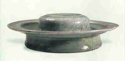 汝瓷青釉茶盞托 通體作盤式,盤心飾一蓮花辨組成的盞托凸起,下有喇叭形圈足,器表滿飾粉青釉,底心露胎無釉,工藝精湛,具有較高的藝術(shù)水平。盤徑17.6厘米,足徑12.4厘米,盞托徑5.8厘米,通高4.8厘米,寶豐清涼寺汝官窯址發(fā)掘出土。此件為傳世御用汝瓷中所未見,制作講究,工藝精細(xì),釉層勻凈,開片密布,釉色粉青,蓮花裝飾,造型大方、美觀實用,實為汝窯御用器之上等佳品。