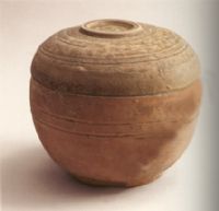 缽形蓋,頂部設(shè)飾圈足狀捉鈕,蓋面飾凹弦紋兩周,子母口,深弧腹并緩收,腹中部飾凹弦紋兩周,圈足,釉已剝落。