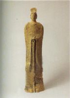 俑頭戴小冠,身穿寬袖深衣,無領(lǐng),肩部前后似裲襠衫以褡袢聯(lián)結(jié),著齊頭翹首履,雙手按環(huán)首刀。該俑具有北朝俑塑的典型特點(diǎn),形體造型夸張,體態(tài)修長,寬衣廣袖,塑造線條簡潔明快。其面部刻畫較為生動(dòng),相貌清秀祥和,表現(xiàn)出秀骨清象的魏晉風(fēng)度。