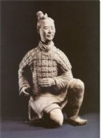 武士呈單跪射箭狀,頭頂一側挽高髻,髻根用朱紅帶束扎,似風吹動,眉目清秀,平視前方,目光炯炯有神,神態(tài)莊嚴。