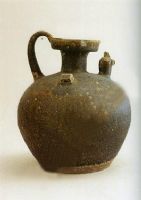 壺盤(pán)口、細(xì)頸、無(wú)肩、腹圓鼓,壺身肥大,呈球狀,無(wú)足平底,腹底部露胎,胎呈灰色,施黑釉,釉面不均勻,有漏釉,開(kāi)片紋,龍形把手,上端聯(lián)于盤(pán)口沿,下端聯(lián)于壺上腹,雞首形的流,長(zhǎng)頸高冠,圓腹上方兩邊有對(duì)稱(chēng)的橋形鈕。根據(jù)龍把雞首壺的造型及黑釉的特點(diǎn),該器為典型的東晉德清窯產(chǎn)品。