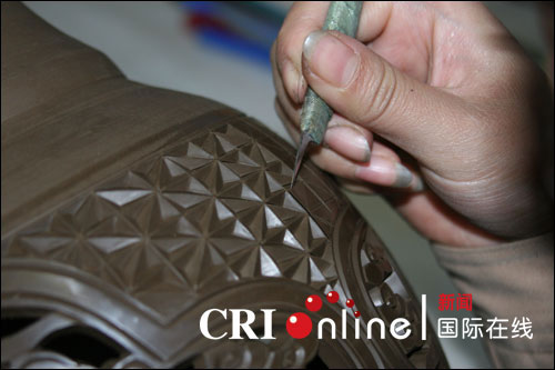 工藝人員在泥胎上雕刻花紋,被稱為淺刻