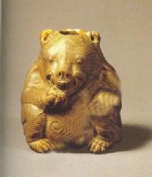 青瓷熊尊為灰色胎,青黃色釉,釉色允潤。模制成型。造型作一熊踞坐吃食狀。一爪捧物置口前,一爪放腹上,矯健中而露憨態(tài),逗人喜愛。通體飾茸毛狀紋和卷曲紋。頂部有一圓孔,可能以插燭或作酒器或作水滴用。為六朝青瓷精品。