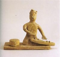 撫琴俑通體施青釉,而下半部釉基本脫落,底部露胎,釉層較厚。撫琴俑其底座與鼓、琴、俑等融合一體,而鼓、琴、俑置于底座之上,生動形象地顯示出樂俑在舞臺上的表演。