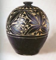 小口,短頸,圓腹,腹下漸斂,圈足,砂底,瓶身在黑色釉地上刻花兩層,肩部剔菊瓣紋一周,腹上用剔劃技法作出花草紋、卷葉紋四組,足部無(wú)紋飾.