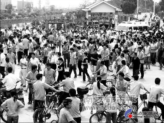 現(xiàn)場執(zhí)勤的數(shù)十警察和治安員,多次想拉起警戒線劃出一條通道,都被情緒激動的員工圍堵而無法實(shí)施。中午12時(shí)許,在大批增援的特警維持下,兩條用警察站成的人墻騰出了一條通道,進(jìn)出車輛才緩慢通過。