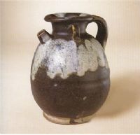 之間,另兩面各有一系,壺裹外均施釉,外部施釉不及底,釉呈黑褐色,口上有色斑紋三個(gè),腹部?jī)擅嬗胁灰?guī)則琉璃點(diǎn),斑點(diǎn)均為灰度藍(lán)色。