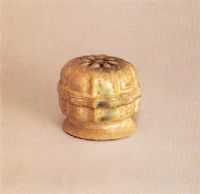 圓形,盒蓋與盒底子母口扣合,蓋項模印八角形凸花,蓋壁弧狀,上下口邊為多邊菱形,束脛,喇叭形圈足稍外撇。足底模印行書(張)字陽文。