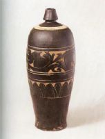 瓶小口,短頸,溜肩,長(zhǎng)腹,足微外撇,內(nèi)凹式圈足。通體施黑釉。肩部刮釉一圈,腹部有剔花紋飾兩層;上層為纏枝花紋,下層為蓮瓣紋,紋飾間以弦紋相隔,紋飾風(fēng)格粗獷。此瓶從口的特征及釉色、支燒方法、紋飾等幾方面看,應(yīng)為山西地區(qū)瓷窯產(chǎn)品。