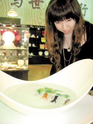 昨日,唐山國(guó)際會(huì)展中心展館展出了一個(gè)新奇的“魚(yú)缸”。據(jù)廠(chǎng)家介紹,這個(gè)造型別致的瓷器并非魚(yú)缸,而是為大型賓館、酒店設(shè)計(jì)生產(chǎn)的大沙拉盤(pán)。而將其作為魚(yú)缸則是他們?yōu)樵黾赢a(chǎn)品觀賞性的一個(gè)創(chuàng)意,使原本素面朝天的白色瓷盤(pán)有了生氣,也為整個(gè)陶瓷展區(qū)增添了一個(gè)小亮點(diǎn)。