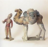 駝通體彩繪,伸頸揚(yáng)頭,駝背上鋪有橢圓形花邊毯子,駝架上橫置紋飾華麗的絲綢袋囊,兩側(cè)掛著扁壺、山雉、野兔、刀鞘、箭囊等物,一變機(jī)靈、調(diào)皮的小猴爬在馱袋上,似在玩耍。俑深目虬髯,身著鮮艷的翻領(lǐng)胡服,側(cè)身站立,昂首挺胸,手作牽拉狀。這一組人物生動(dòng)地反映了當(dāng)年絲綢之路上的運(yùn)輸情景。