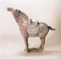 陶馬胎底青灰度,上繪赭紅色。四腿直立于長方形踏板上,鞍韉俱全。陶馬伸頸昂首,馬鬃蓮然聳起,似在作嘶鳴抖擻,纏系著的馬尾屈翹,呈搖擺狀。藝術造型逼真生動,姿態(tài)極為雄健。