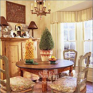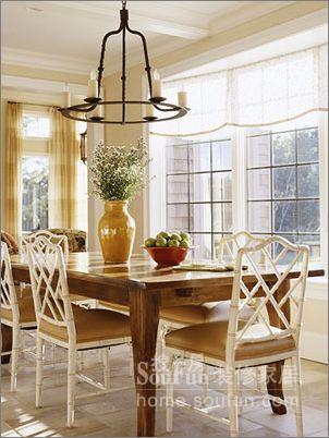 如果你的餐廳鄰近其它的起居空間。那么建議兩個(gè)空間用同一種顏色做基調(diào),再選擇一些不同的,但與主色調(diào)相近的小裝飾品點(diǎn)綴。本圖餐廳,主人就選用了淡黃色的紗簾,金黃色的椅套,使餐廳整體效果看起來(lái)和諧,明快。