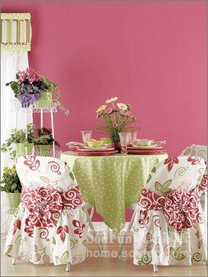 普普通通的折疊椅隱藏在顏色鮮艷,款式新穎的椅套里,與桌上鋪的色彩夸張的桌布相映成趣,平凡立刻得到升華,感覺像置身在一場熱鬧的大Party中。
