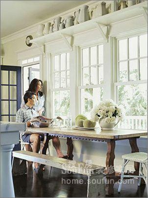 一張簡單的長條木餐桌搭配仿舊的木椅,自然的味道油然而生,仿佛與室外的藍天綠樹融為一體。餐桌上方陳列的一排主人收藏的瓷罐閃著奶白色的亮光,與周圍的環(huán)境相協(xié)調。