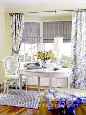 本圖中的休閑餐廳布置得非常優(yōu)雅清爽。盡管空間很小,但藍色系的各種織物將白色的餐桌椅烘托得情調十足,空間也顯得大了很多。