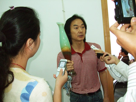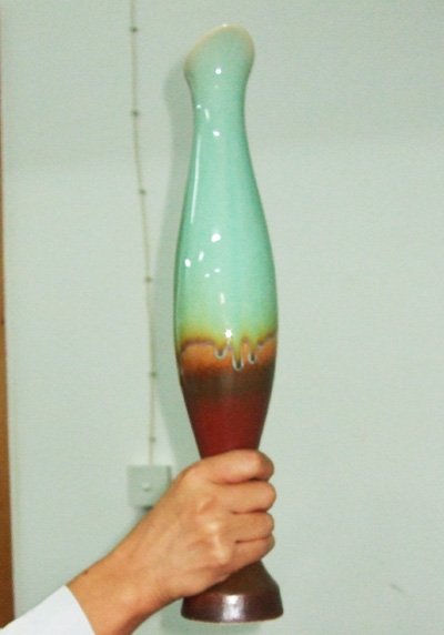據(jù)陶瓷美術(shù)館館長胡忠勝(即參與其設(shè)計(jì)人員之一)介紹,與去年相比,今年的火炬更為進(jìn)步,在原有的基礎(chǔ)上使體重減輕了一些,胎更薄了一些。這個(gè)陶瓷火炬瓶有兩種顏色,下面為鐵銹紅,無光釉,上面采用玻璃釉。再加上無光,有光的烘托效果,是通過火從陶過渡到瓷的一個(gè)這樣過程,從外表上可以很明顯的體現(xiàn)出來。從器型上看,火炬瓶頂端瓶口設(shè)計(jì)成成鴨嘴狀突出外沿。其亮點(diǎn)就是借用火焰在風(fēng)中搖曳至一個(gè)方向,象征著風(fēng)推動(dòng)火焰一樣,象征著一股前進(jìn)的力量,有股向前沖的欲望。并且這種瓶口的設(shè)計(jì)在火焰燃燒時(shí)抵擋風(fēng)對(duì)其的阻礙可起到一定的防護(hù)作用。此款陶瓷火炬瓶的設(shè)計(jì)還是由上屆民間民俗文化協(xié)會(huì)的相關(guān)人員共同完成。據(jù)活動(dòng)舉辦還有一段時(shí)間,我們會(huì)將火炬瓶更加完善,更加細(xì)致化。關(guān)鍵是保證它在傳遞的過程中能經(jīng)得住風(fēng)的阻力,保證整個(gè)傳遞過程中火炬正常燃燒。火炬瓶盛放燃料初步定為煤油,保證可燃燒去年活動(dòng)整個(gè)時(shí)間三十分鐘。